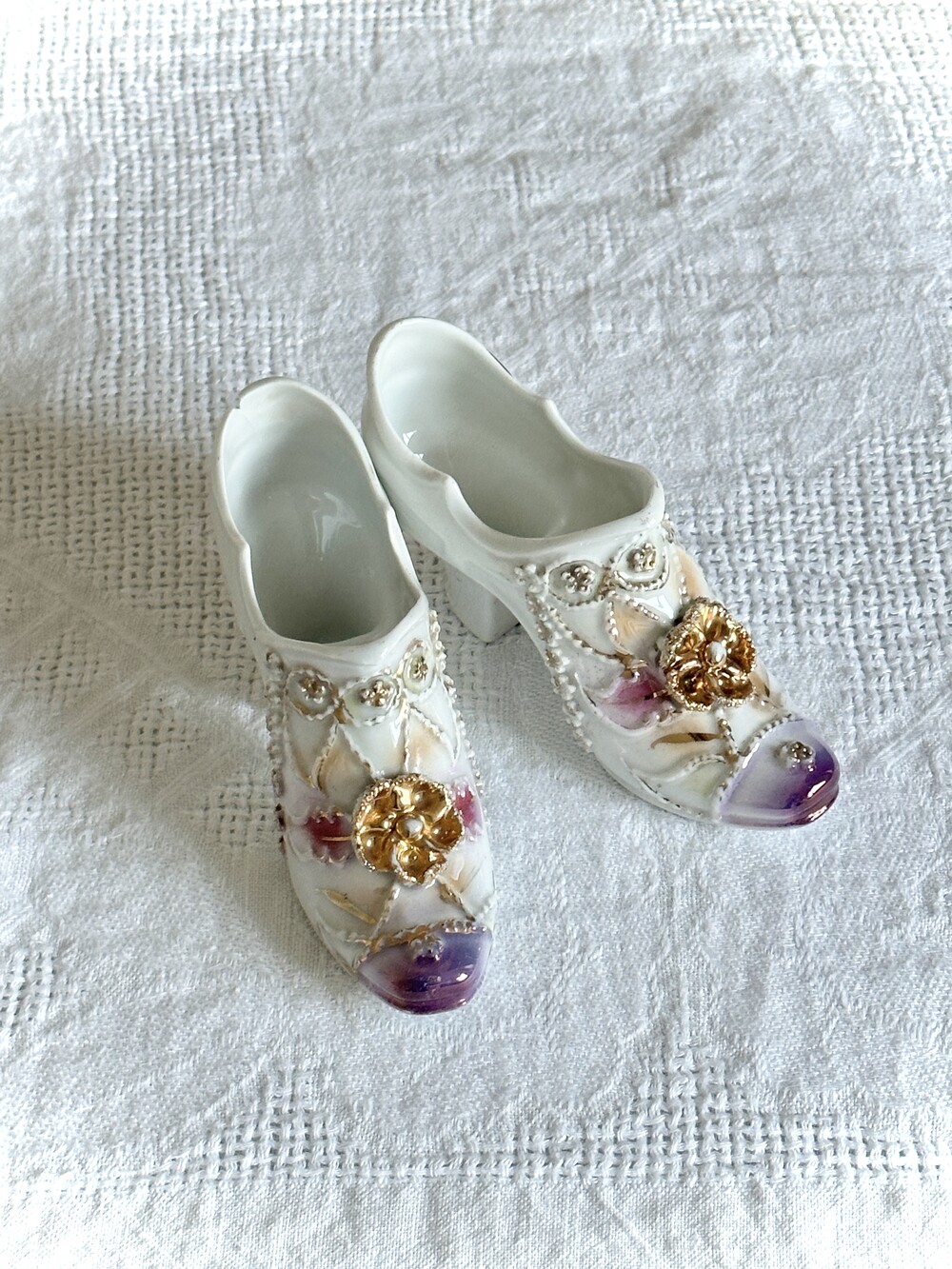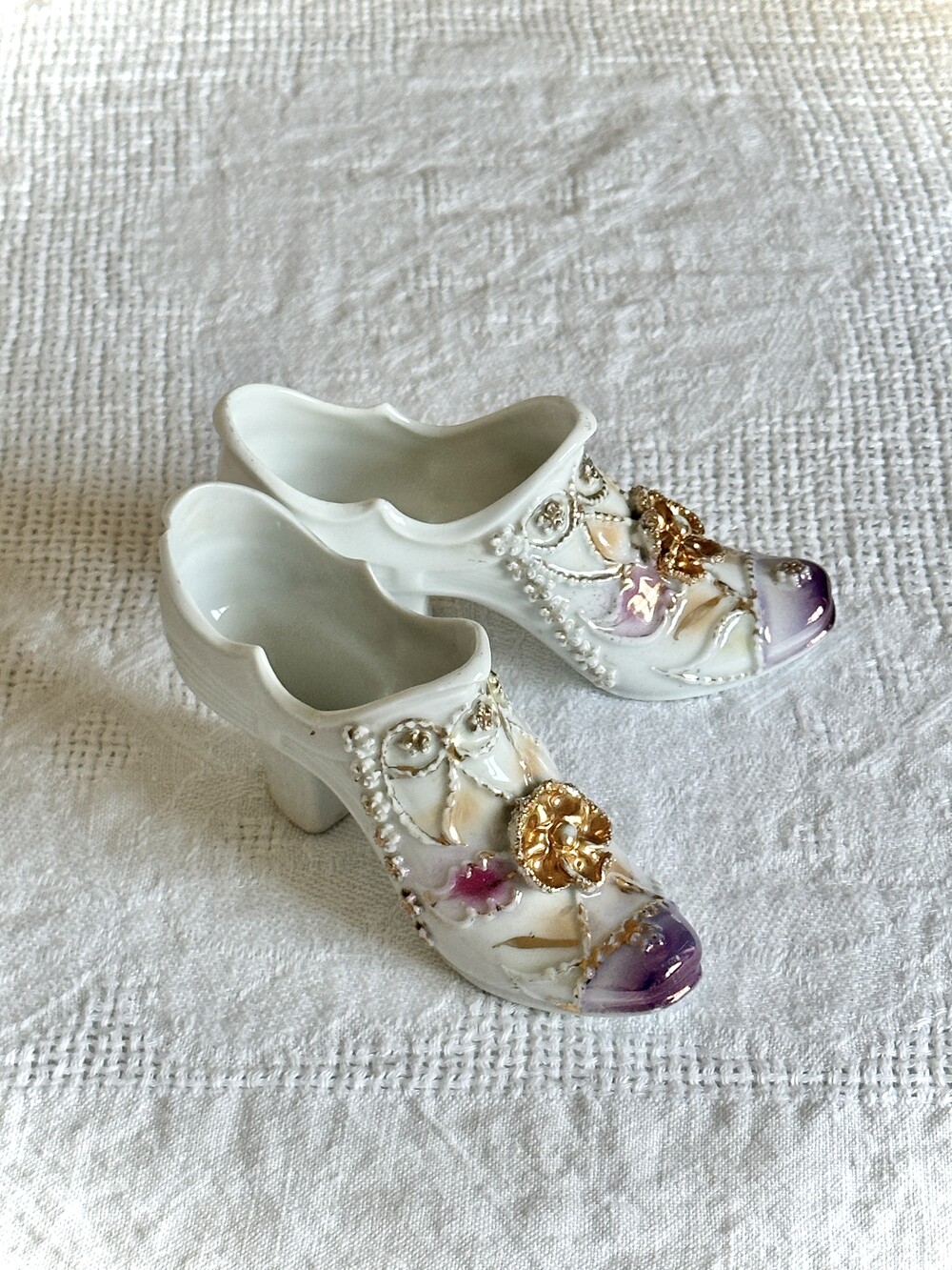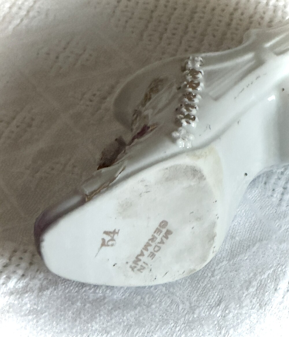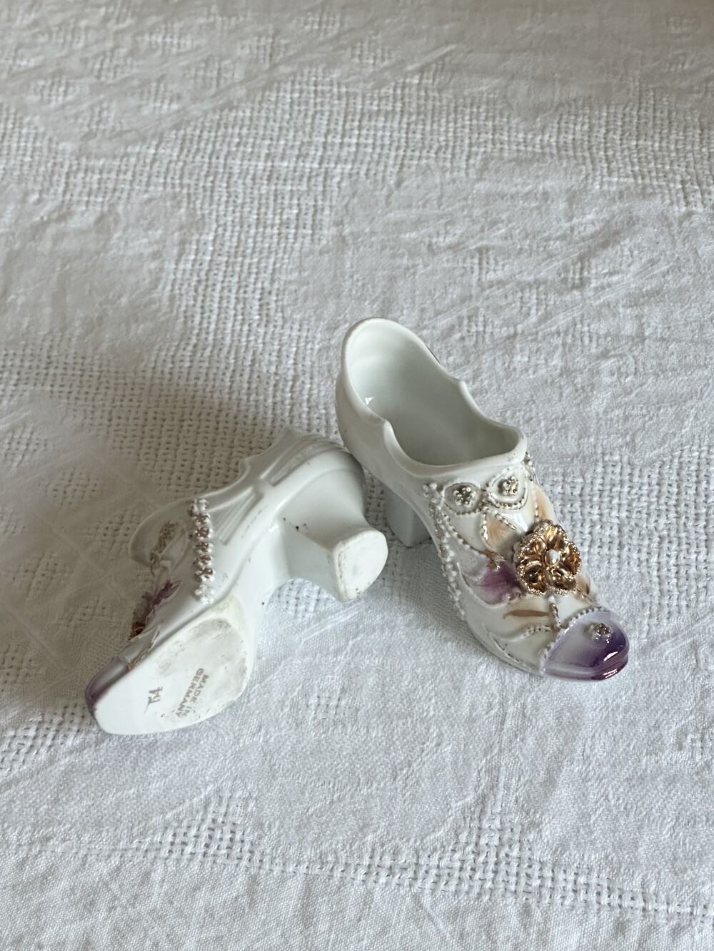 독일 바바리아,튀링겐 계열 공방에서 제작된 빈티지 포셀린 드레서 슈즈입니다. 손으로 채색된 보라-핑크 톤의 컬러와 금장 디테일, 올록볼록한 레이즈 에나멜 장식이 특징이며, 1950–70년대 독일 장식 도자기 특유의 화려하면서도 우아한 분위기를 담고 있습니다. 작은 악세서리나 반지를 올려두는 오브제로도 잘 어울리며, 단독으로 장식해두어도 아름다운 수집용 아이템입니다