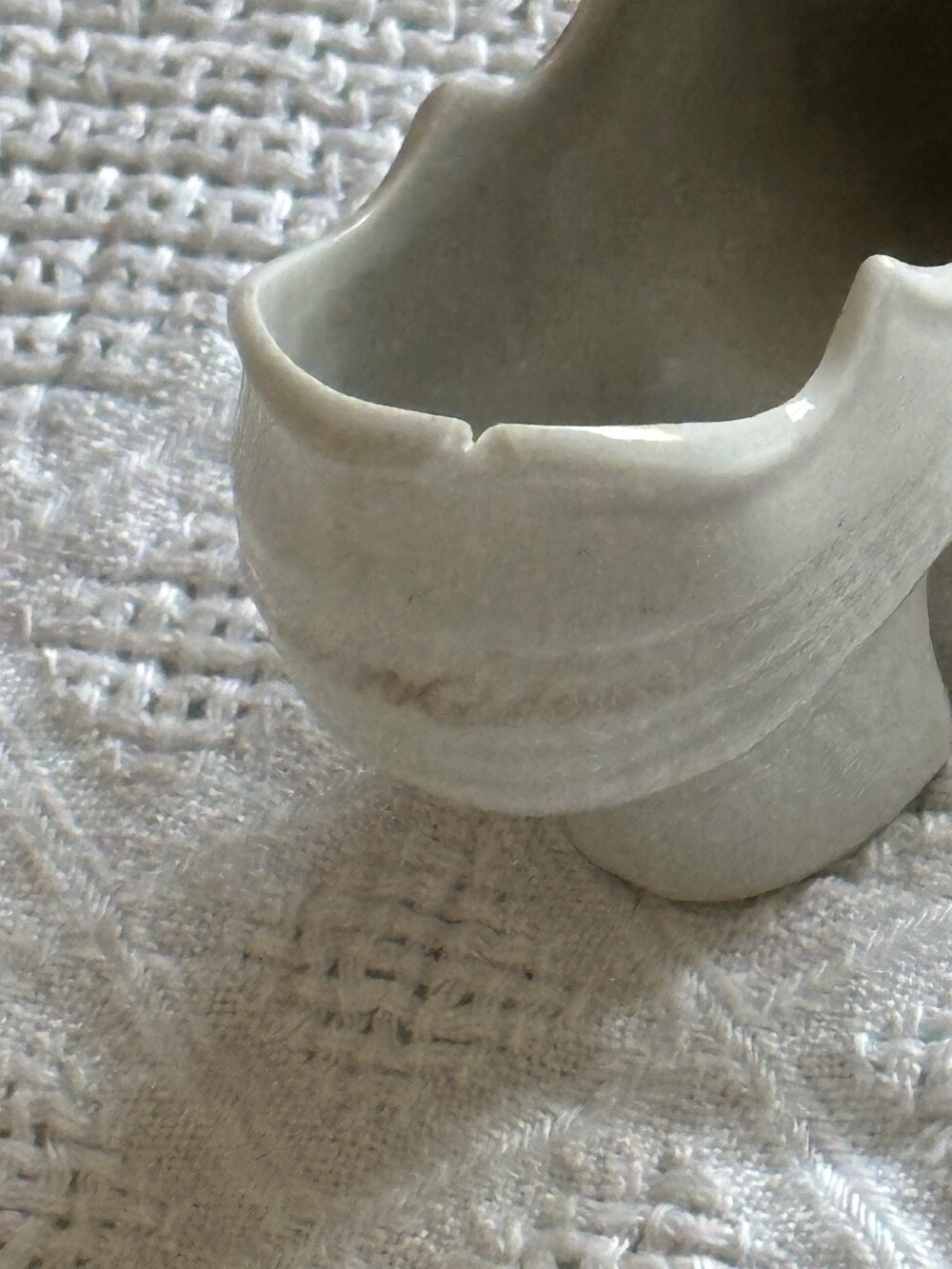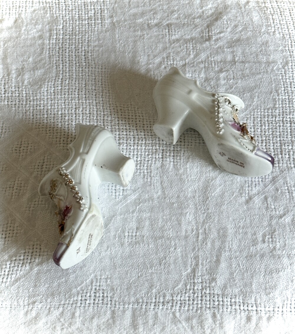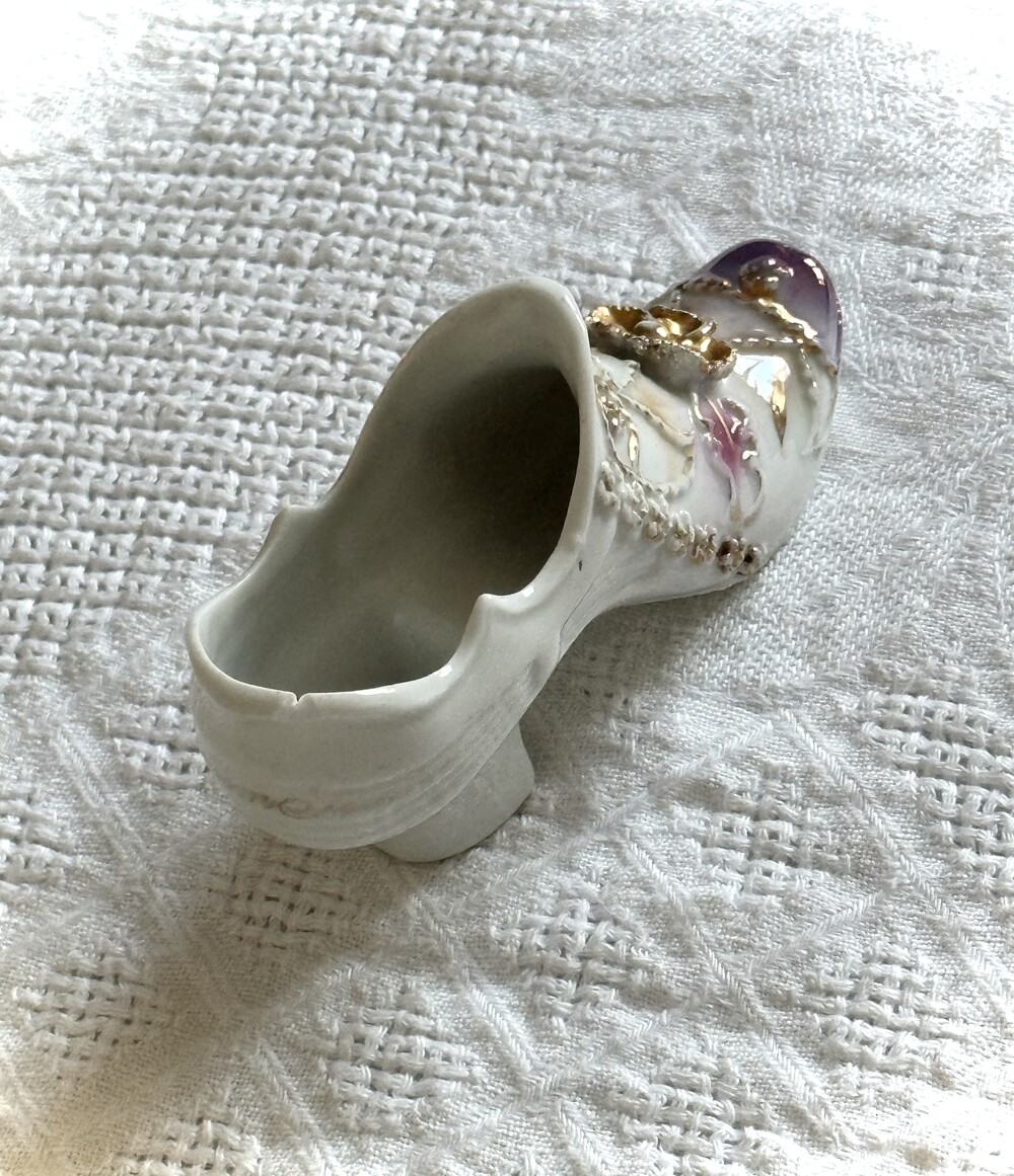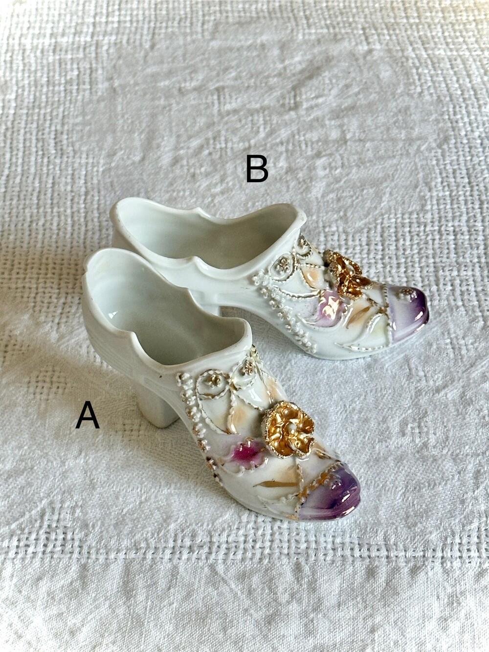 독일 바바리아,튀링겐 계열 공방에서 제작된 빈티지 포셀린 드레서 슈즈입니다. 손으로 채색된 보라-핑크 톤의 컬러와 금장 디테일, 올록볼록한 레이즈 에나멜 장식이 특징이며, 1950–70년대 독일 장식 도자기 특유의 화려하면서도 우아한 분위기를 담고 있습니다. 작은 악세서리나 반지를 올려두는 오브제로도 잘 어울리며, 단독으로 장식해두어도 아름다운 수집용 아이템입니다