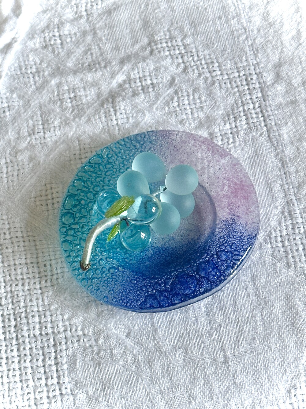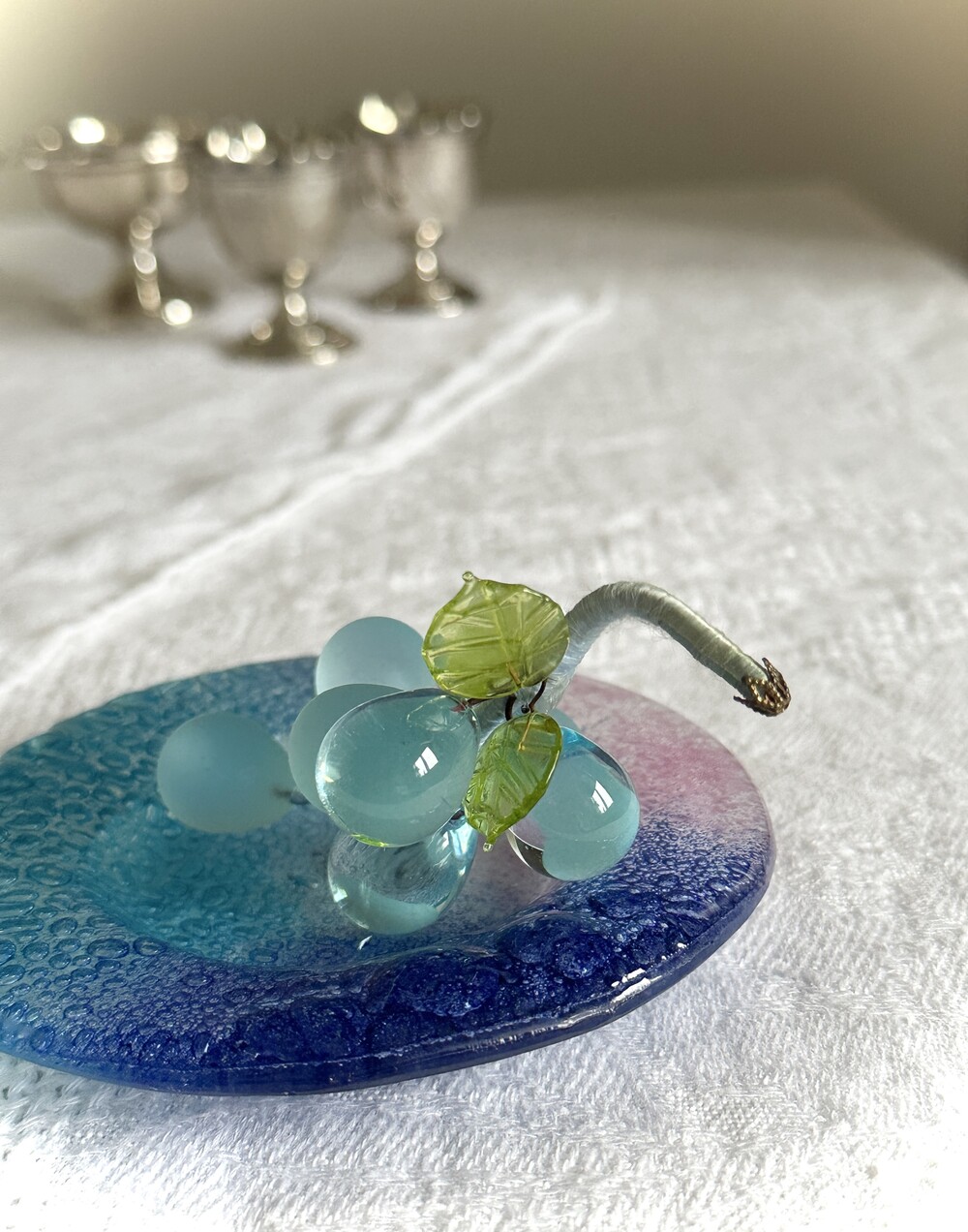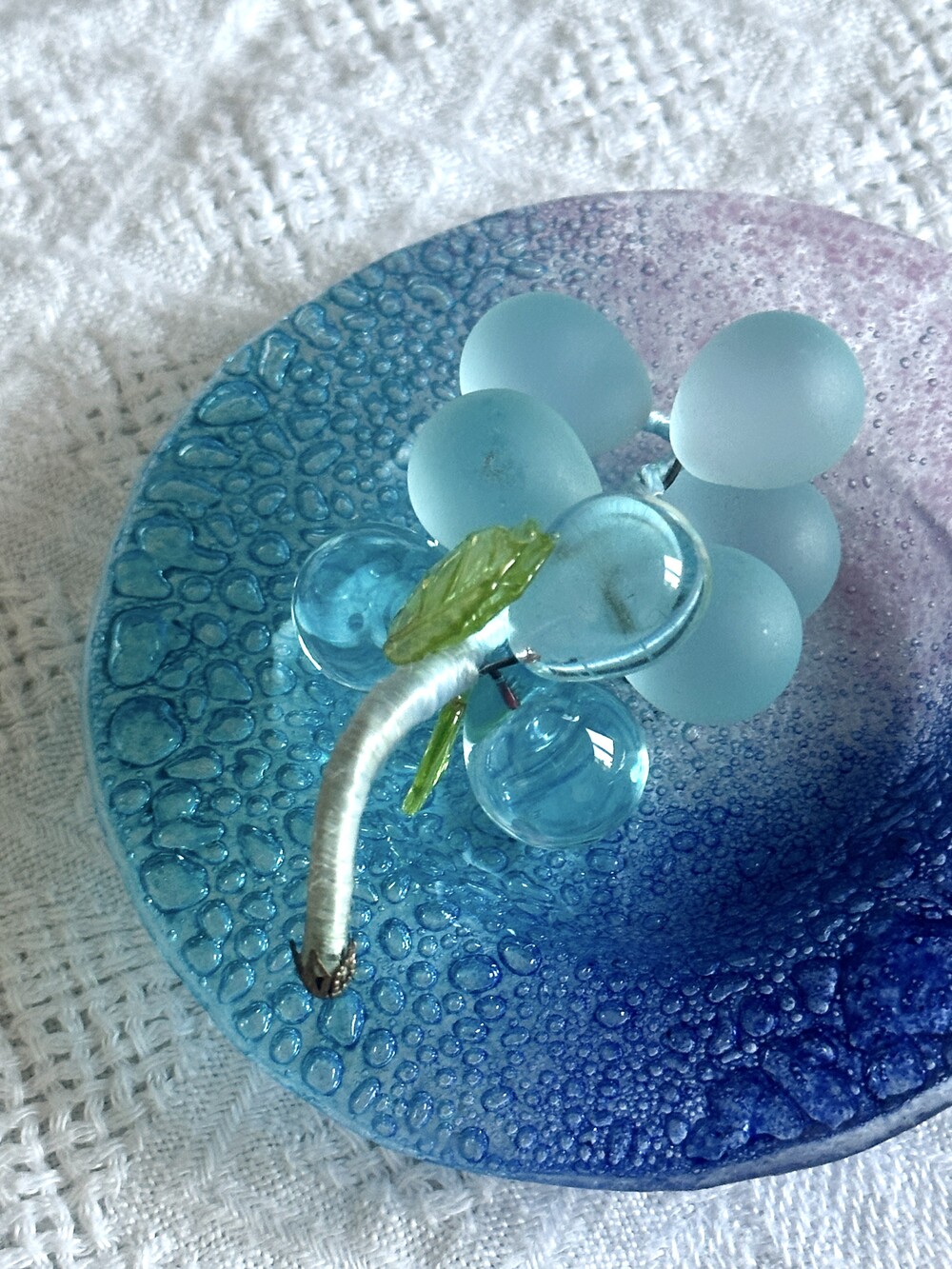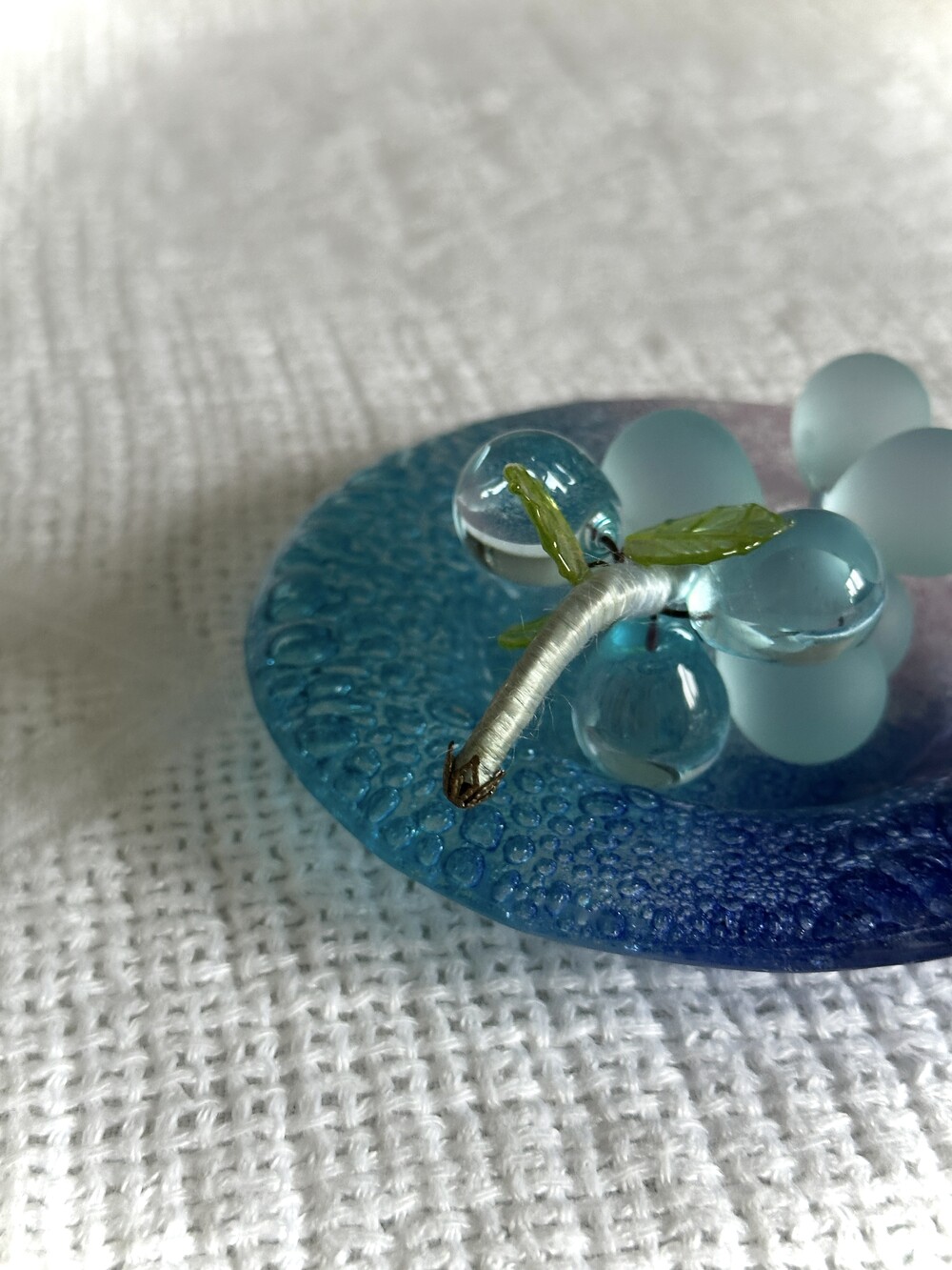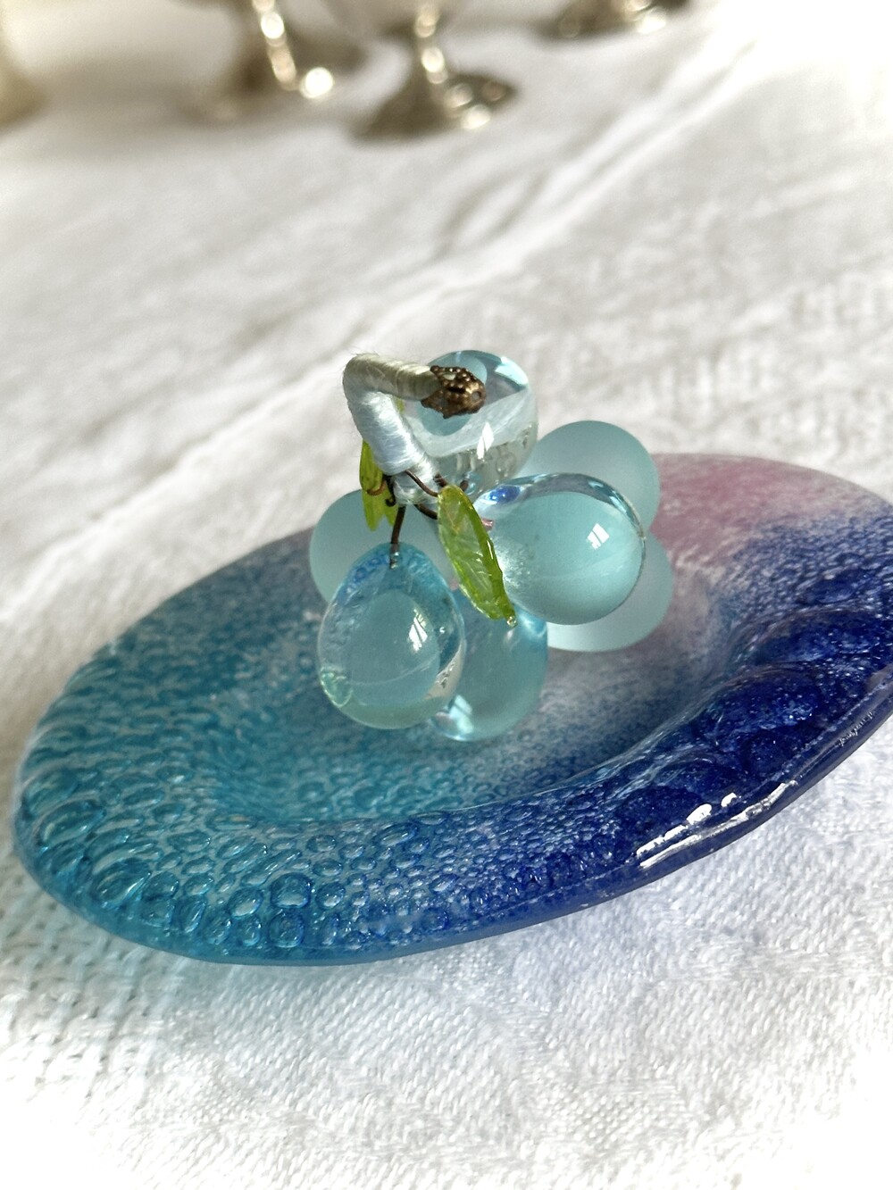 이탈리아 무라노 유리 접시에, 투명한 아이스블루 포도 오브제가 함께 구성된 세트입니다.