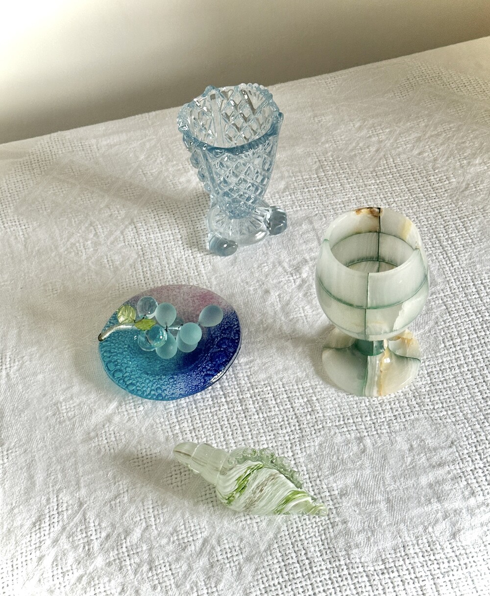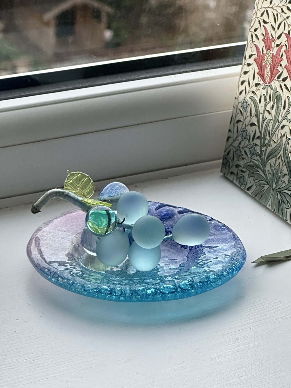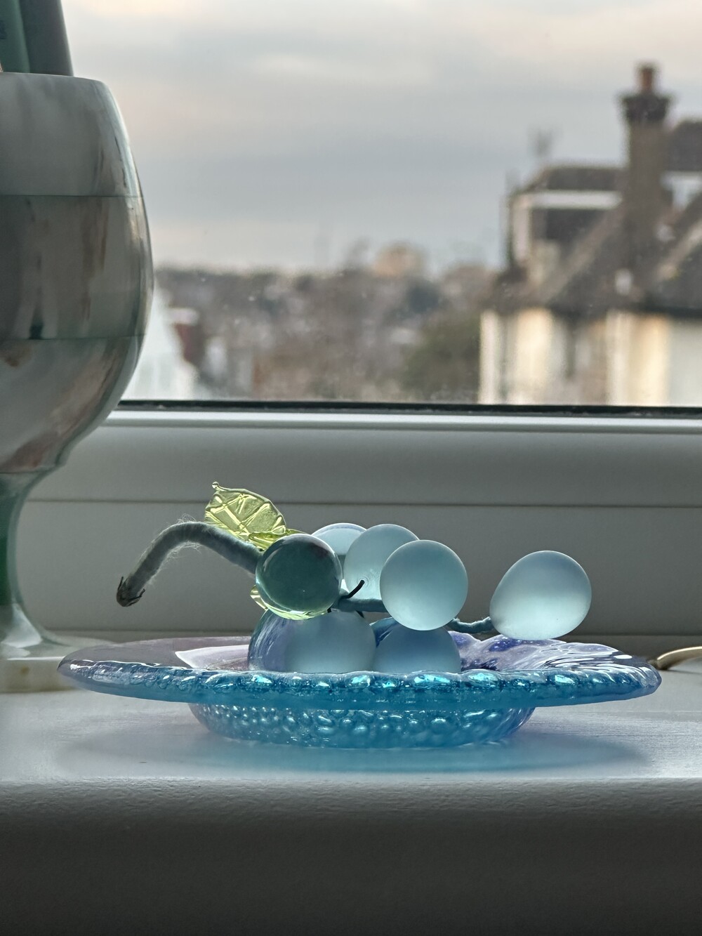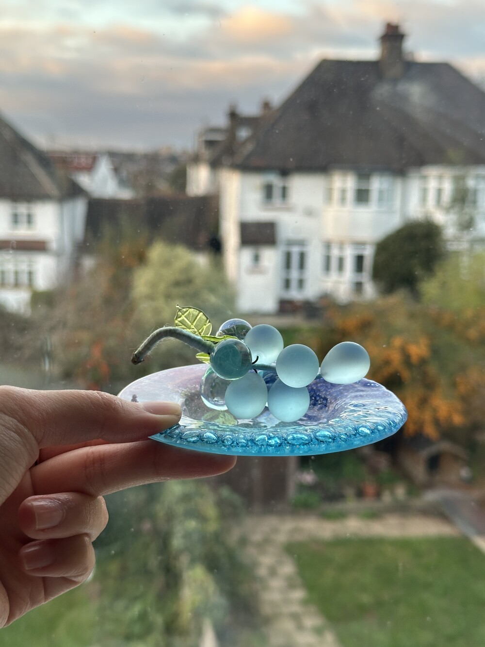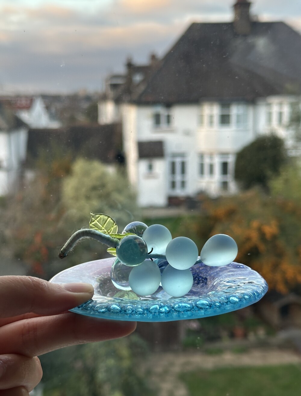 이탈리아 무라노 유리 접시에, 투명한 아이스블루 포도 오브제가 함께 구성된 세트입니다.